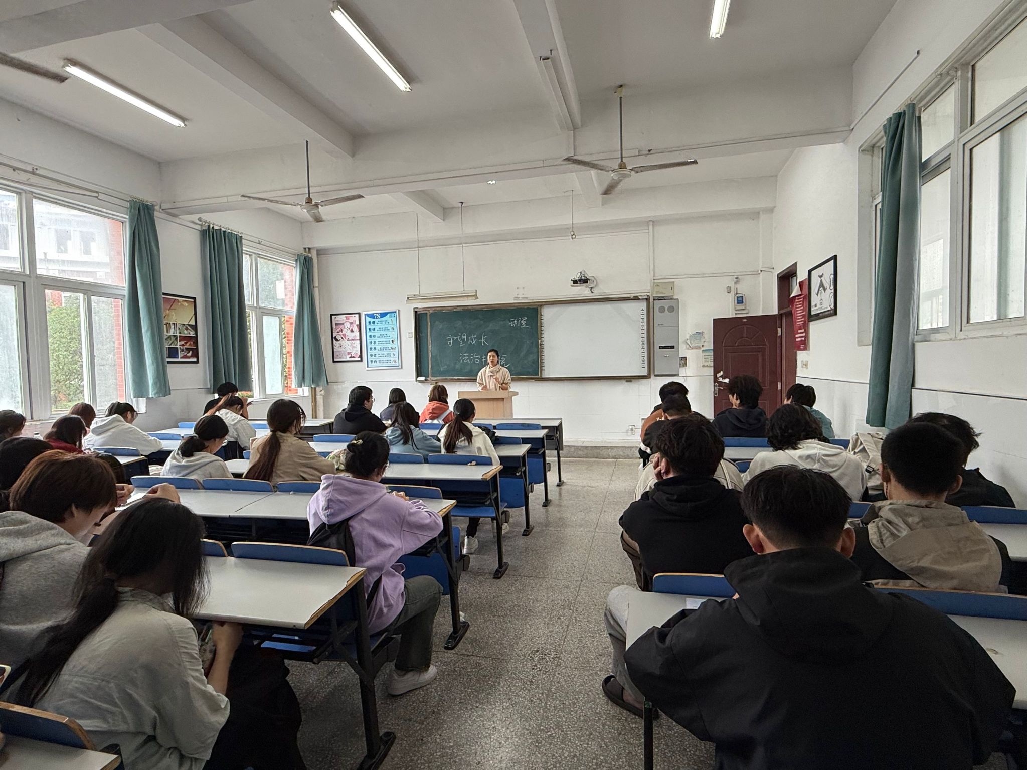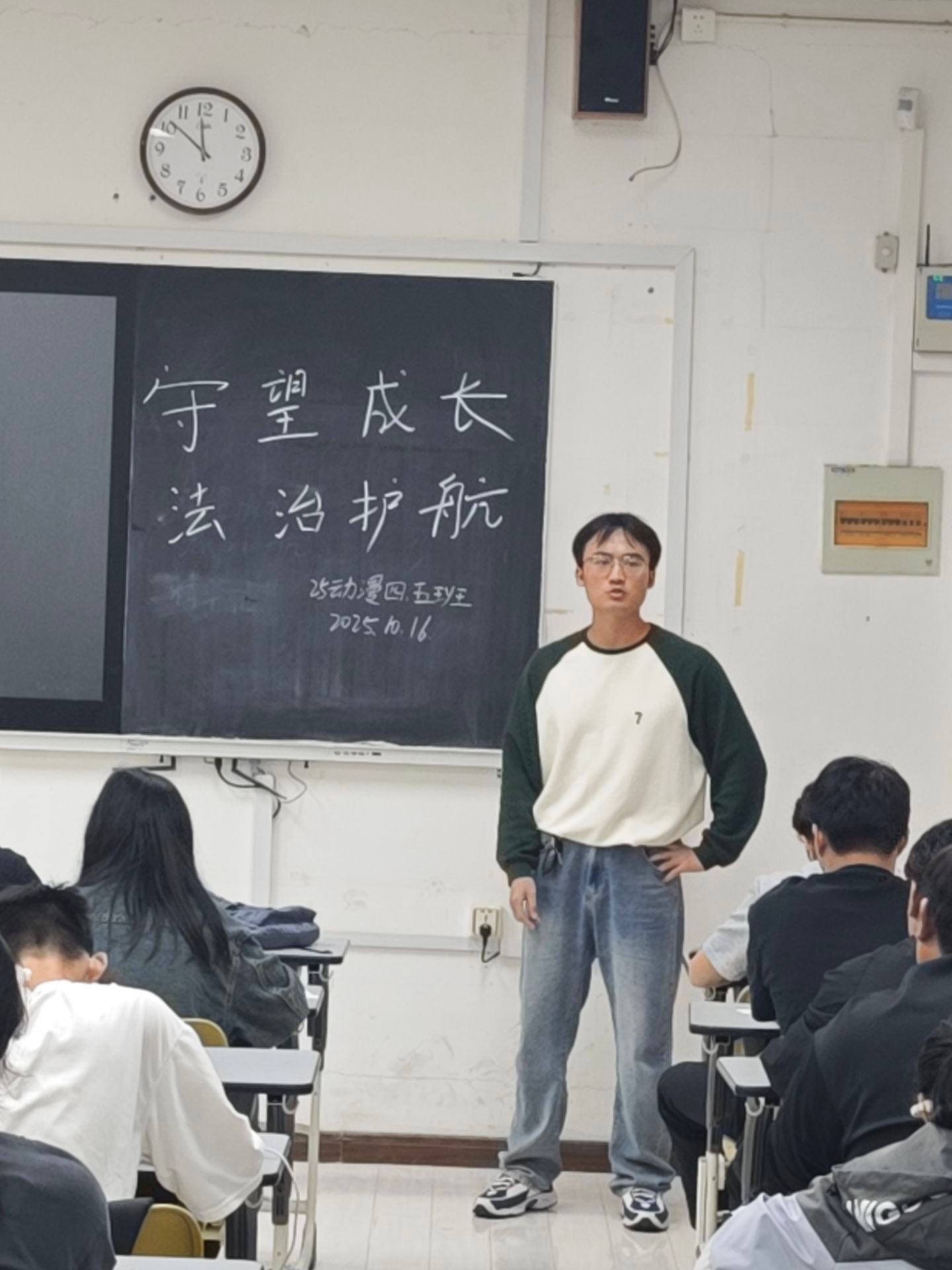 辅导员在班会现场精心构建沉浸式、互动式的教育场景,引导学生在真实案例剖析与思辨中感悟法治精神,筑牢成长防线。并结合生活中常见的案例,深入浅出地讲解了宪法的基本内容、重要地位以及与大家日常生活息息相关的联系,让同学们对宪法有了初步的认识。