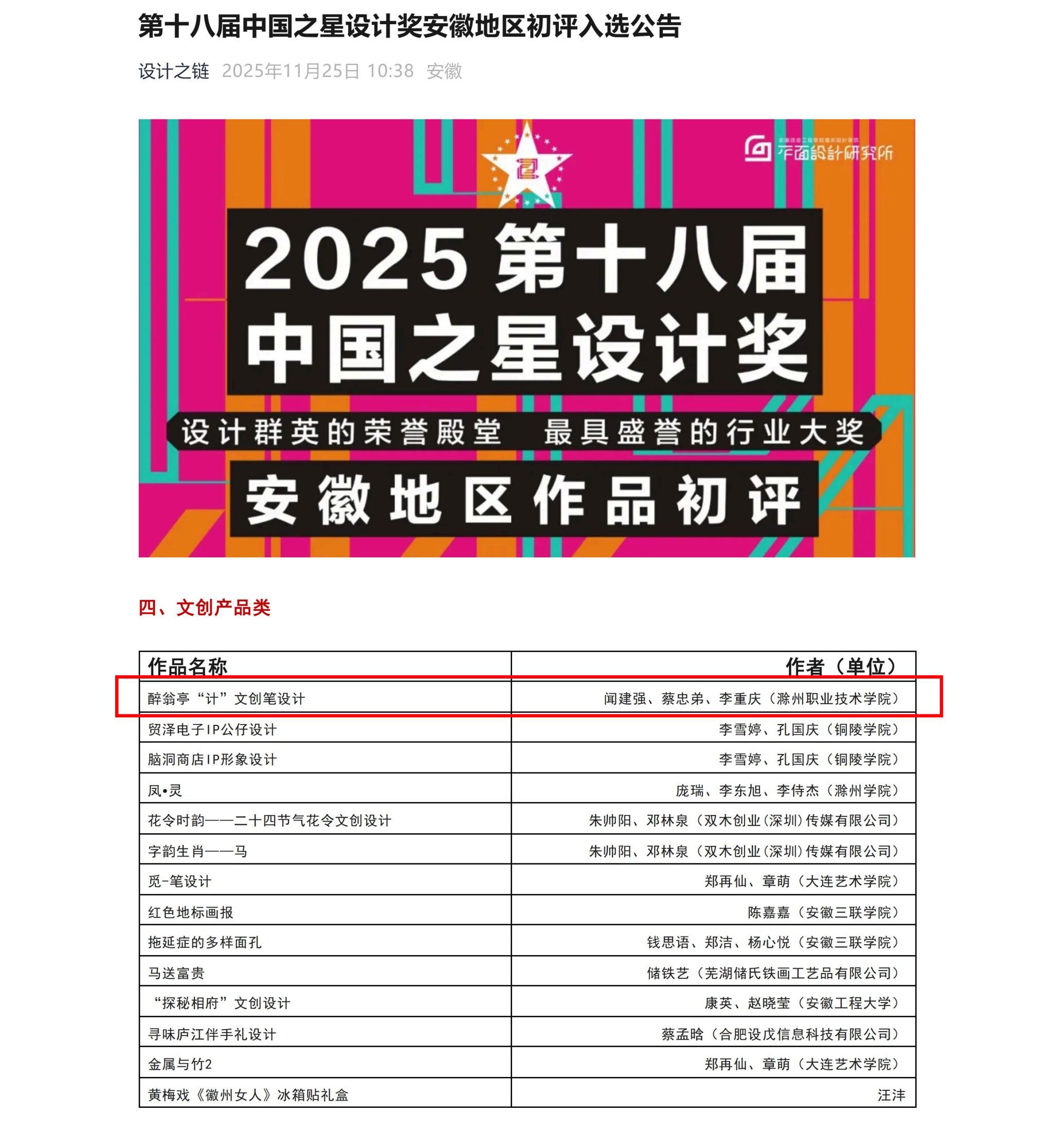 近日,2025第十八届中国之星设计奖(安徽地区)初评结果正式揭晓。由我校传媒与设计学院闻建强、蔡忠弟、李重庆三位老师共同创作设计的文创作品——《醉翁亭“计”文创笔设计》,历经严格评审,从安徽赛区千余件有效参赛作品中脱颖而出,成功入选并晋级全国复评阶段。