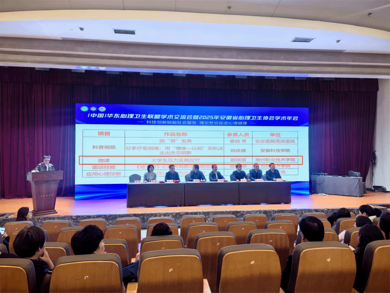 会议期间,心理卫生协会举办了第二届安徽省心理科普微课与实践技能大赛颁奖仪式。该大赛共设置了心理科普视频、心理微课、心理咨询及心理治疗面谈技能、应用心理案例四个分赛道。基础教学部教师疏琪琪凭借作品《大学生压力及其应对》荣获“微课专业组”一等奖。