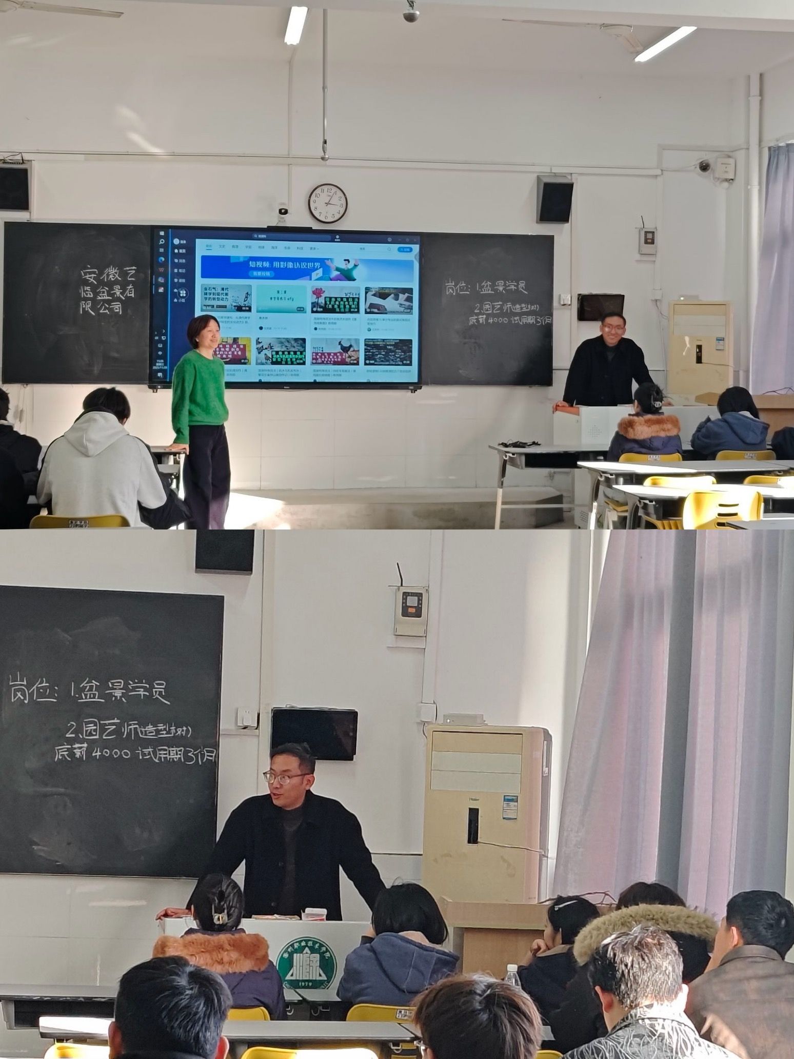 为深化产教融合,助力食环学子精准对接行业需求,11月26日,安徽艺临盆景有限公司校园招聘宣讲会在我校致善楼2203教室成功举办。本次宣讲会由食环学院组织,园林系主任贾雪晴老师及园艺技术、环境艺术设计等专业学生参与。