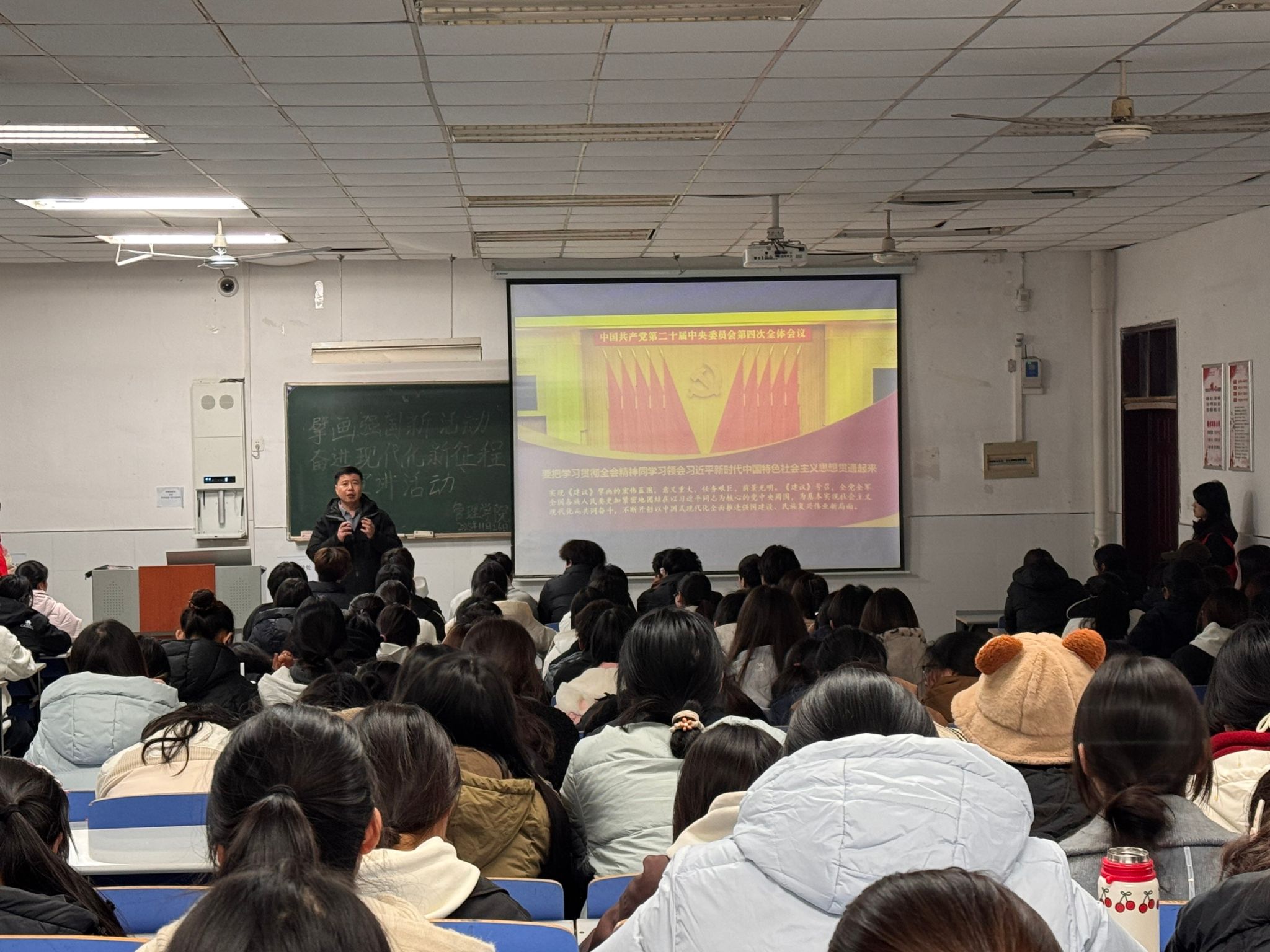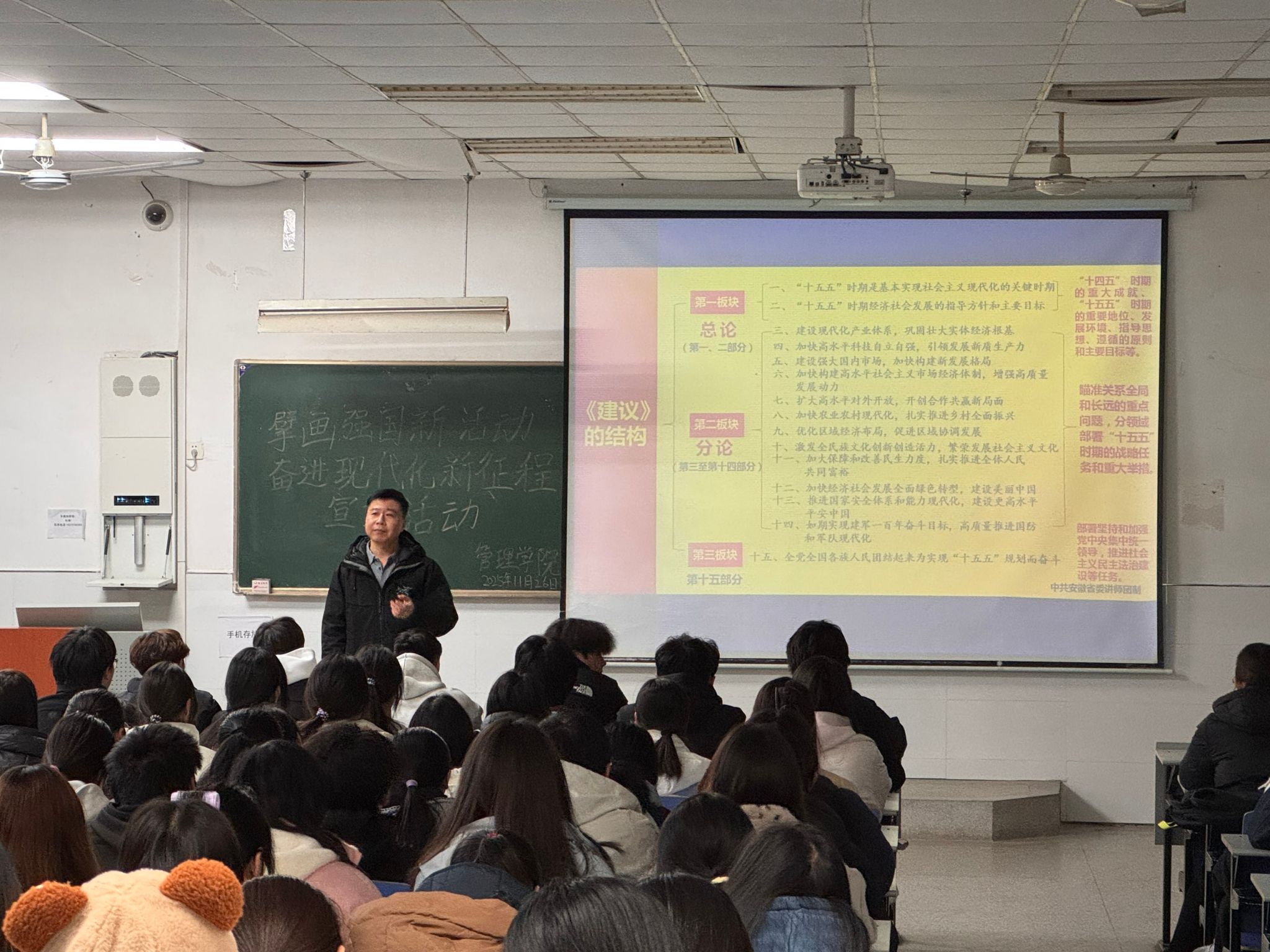 讲座中,主讲人围绕党的二十届四中全会精神,结合“十五五”规划建议系统解读全会战略部署。主讲人从全会“承前启后”定位切入,分析“十五五”规划时期的重要意义,拆解“高质量发展”下六大发展原则,厘清全会布局逻辑脉络;结合管理学院学科特点,衔接全会关于新质生产力培育、高水平社会主义市场经济体制构建的部署,分析管理领域与现代化建设结合点,解读管理人才所需能力,引导思考专业知识实践路径,并强调青年学子需立足专业融入“十五五”发展大局、扛起时代责任。参与讲座的学子表示,此次讲解让大家清晰领会了全会精神内核与 “十五五” 规划的核心要求,深刻理解了管理学科在现代化建设中的定位与价值,也为自身专业学习、职业发展明确了方向,进一步树立起将个人成长与国家发展大局紧密结合的意识。