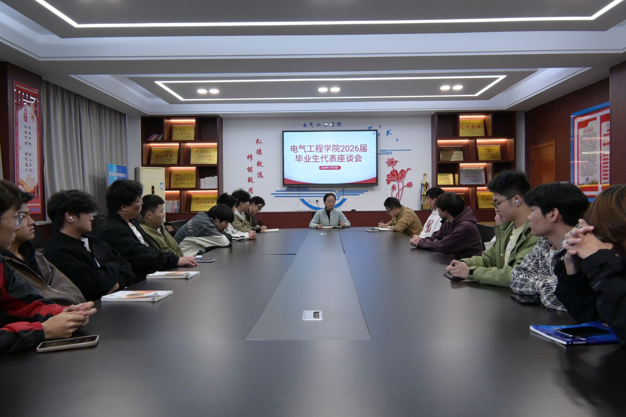 在2026届毕业生求职季,为及时了解毕业生的思想动态,听取他们对于学院就业服务工作的意见和建议,11月13日下午,电气工程学院在5304会议室召开2026届毕业生代表座谈会,学院领导、毕业班辅导员夏舒、姜帅、来自各专业的13名毕业班学生代表参加了会议。会议由学院党总支书记薛天飞主持。