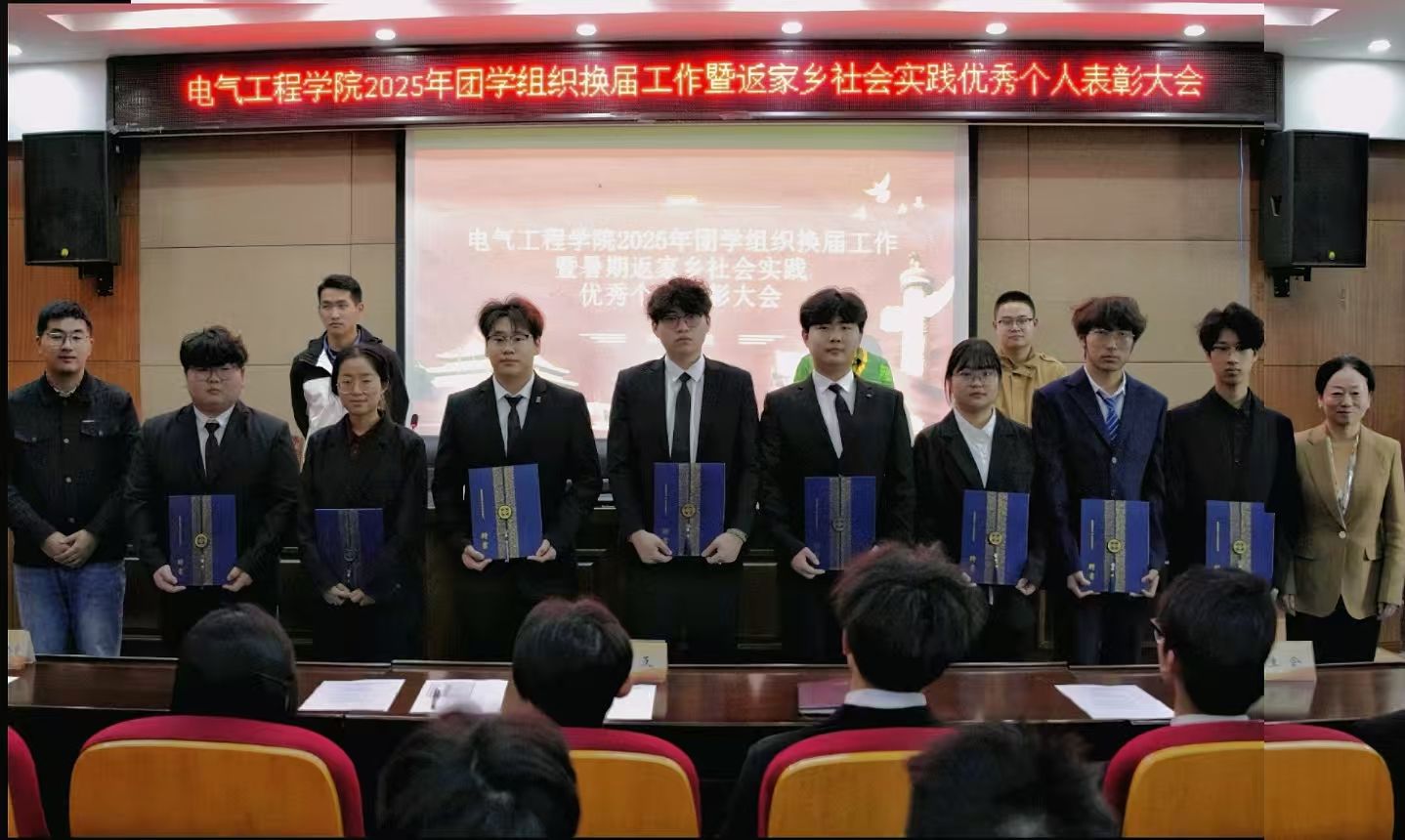 为夯实团学组织工作根基,凝聚青年力量,助力学院发展新征程,11月4日,电气工程学院换届暨返家乡社会实践表彰大会在南阶205教室召开。电气工程学院党总支书记薛天飞、学生管理党支部书记夏舒、团总支书记臧铭、专职辅导员姜帅、张瑞龙,2024、2025年团学干部及2025级主要学生干部出席大会,会议由臧铭主持。