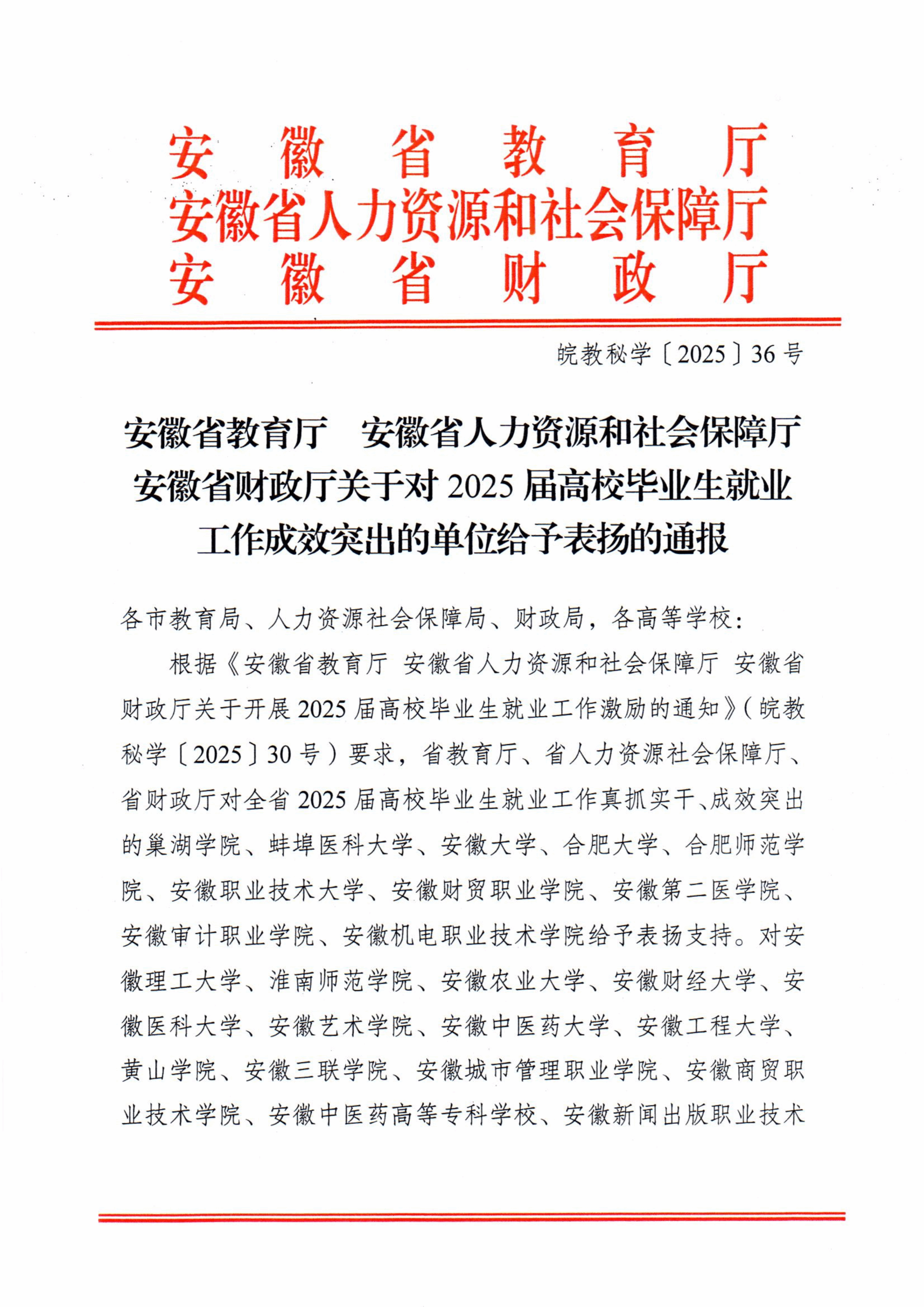 近日,安徽省教育厅、省人力资源和社会保障厅、省财政厅联合发文,对2025届高校毕业生就业工作成效突出的单位予以通报表扬,我校名列其中。这是我校毕业生就业工作继2022年、2024年获激励,2023年获表扬后,再次获得省级表彰,充分体现了我校在毕业生就业工作中的持续努力与突出成效。