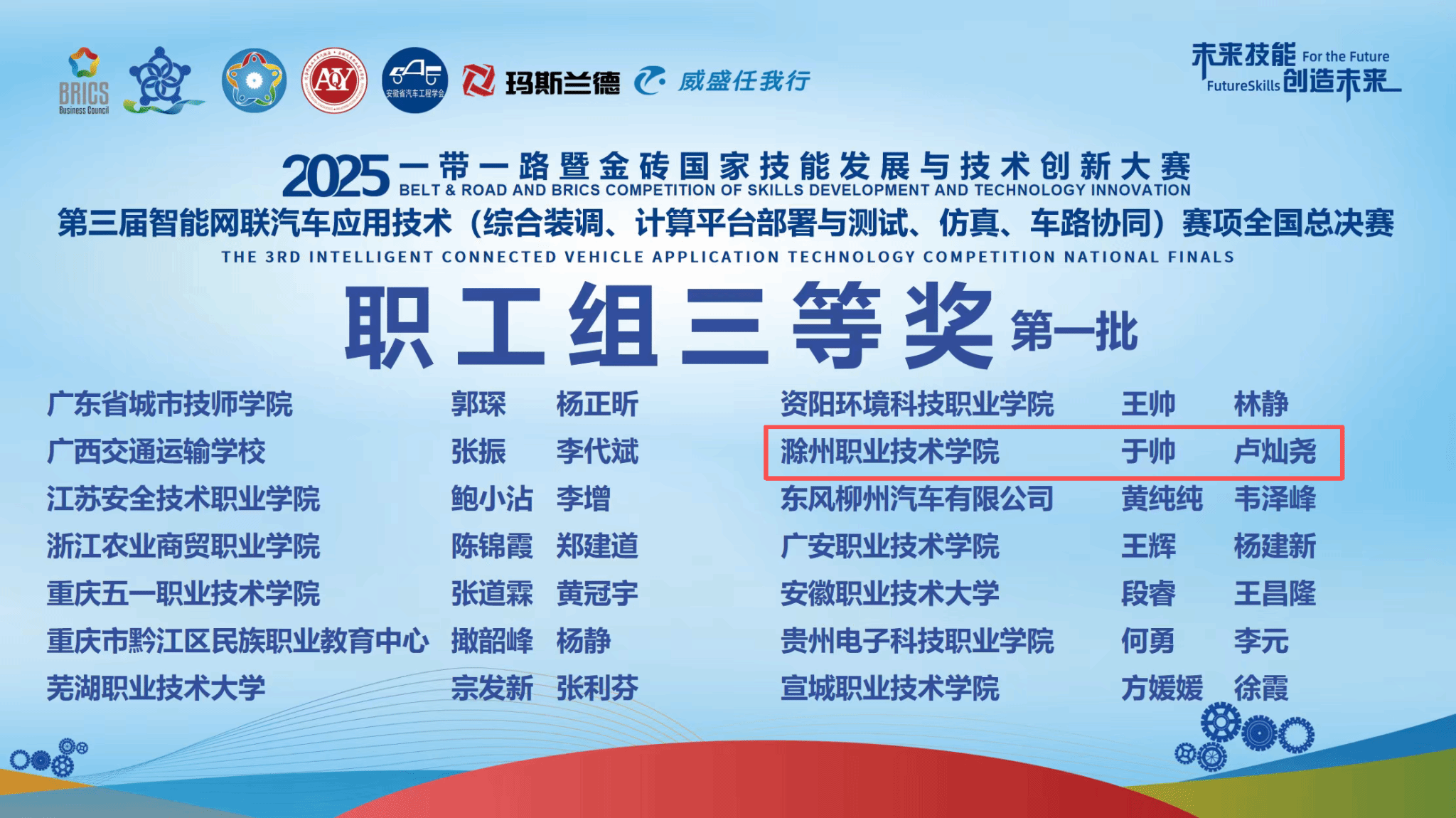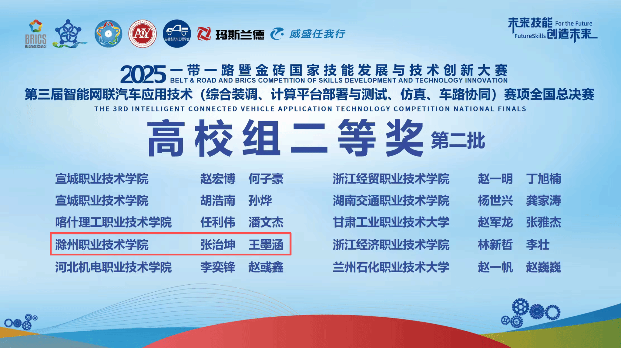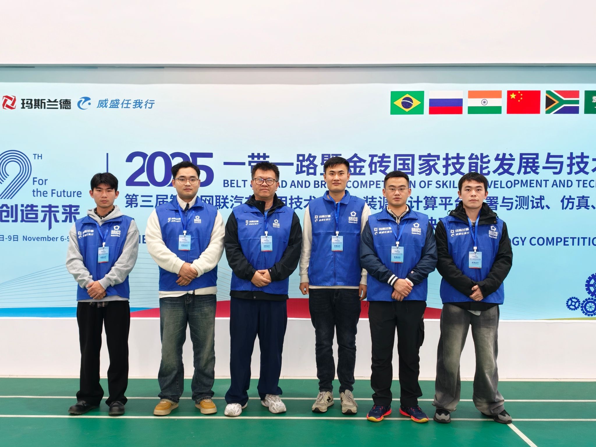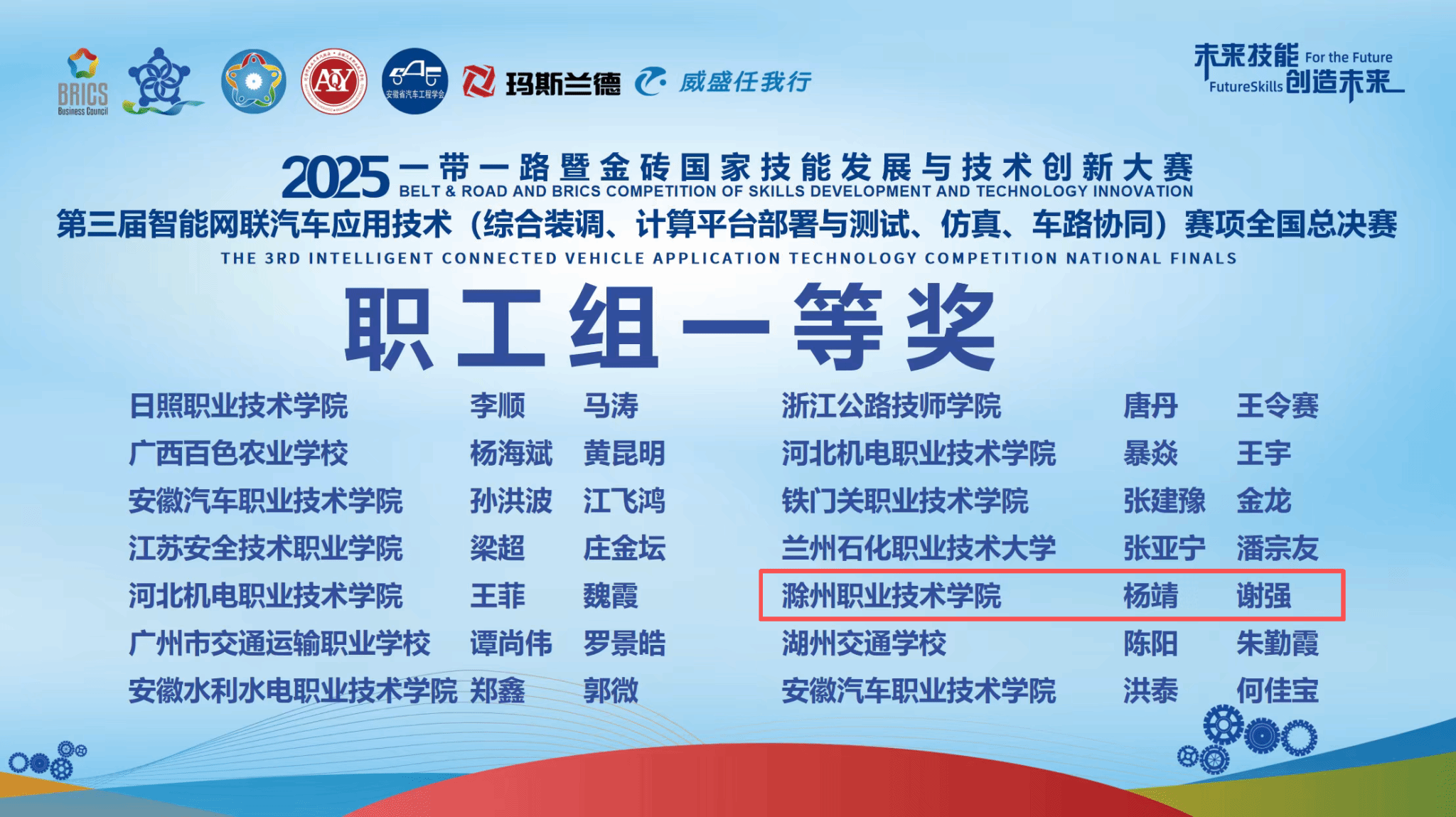 2025年11月7日,2025“一带一路”暨金砖国家技能发展与技术创新大赛第三届智能网联汽车应用技术(综合装调、计算平台部署与测试、仿真、车路协同)赛项全国总决赛在安徽汽车职业技术学院隆重开幕。我校机械与汽车工程学院四名教师与两名学生在赛场同台竞技,在全国290支队伍、580名选手的激烈角逐中脱颖而出,其中职工组杨靖、谢强老师获得一等奖,于帅、卢灿尧老师获得三等奖,学生组在杨章林老师的指导下获得二等奖的好成绩。