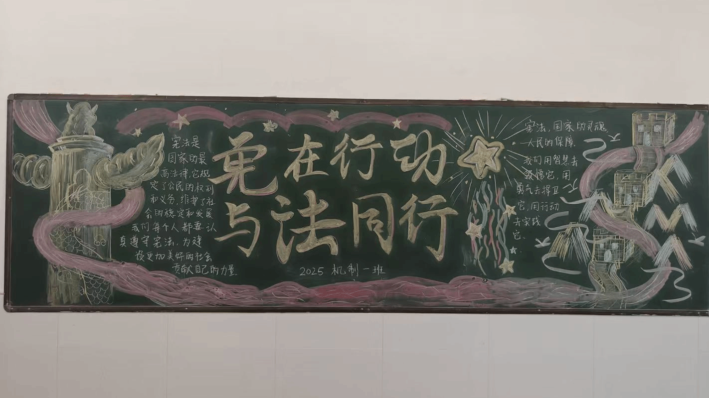 为深入贯彻落实宪法精神,进一步增强师生法治观念,机械与汽车工程学院于2025年12月4日组织各班级开展宪法主题黑板报创作活动,以生动活泼的形式推动宪法知识深入人心。