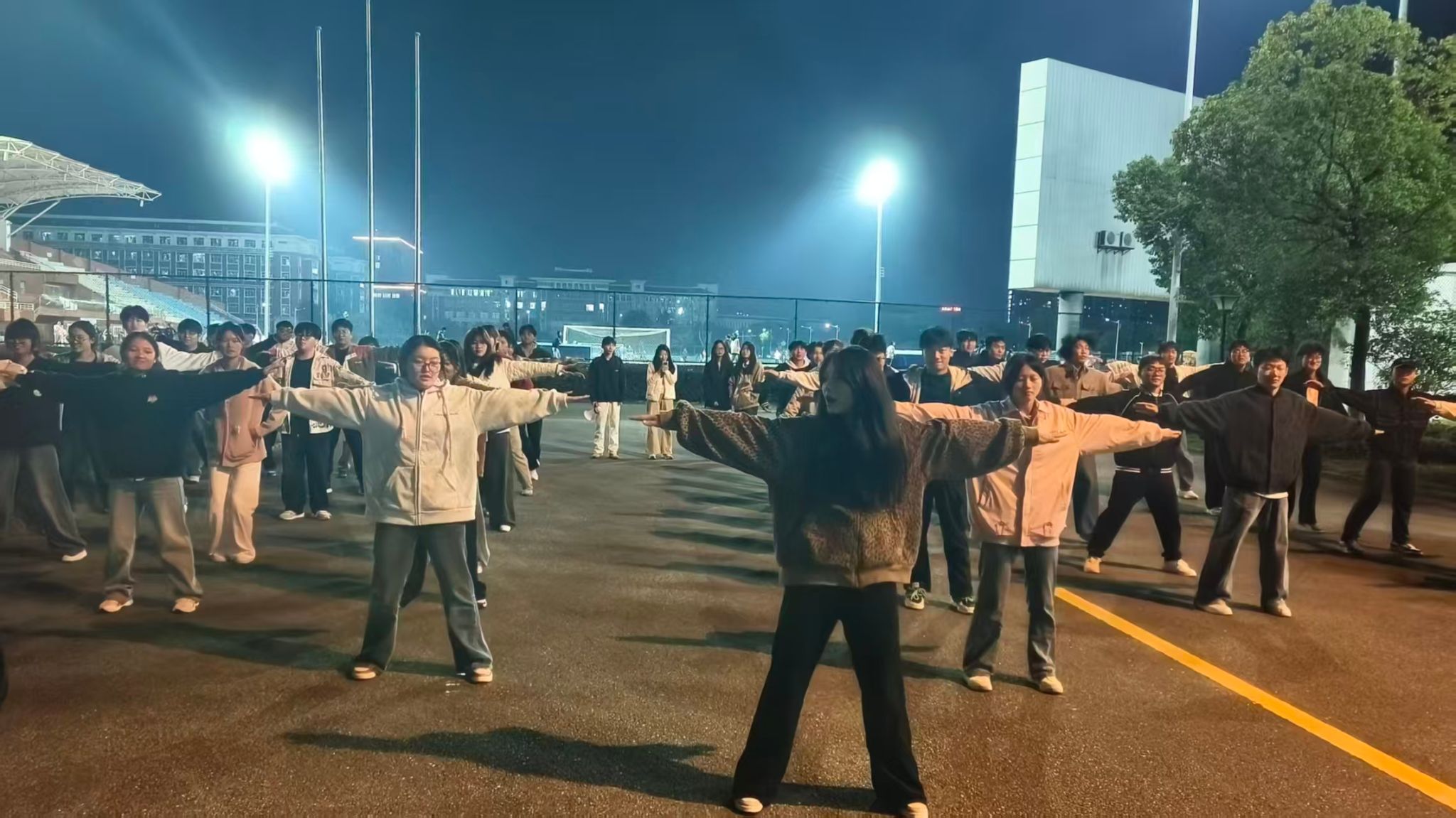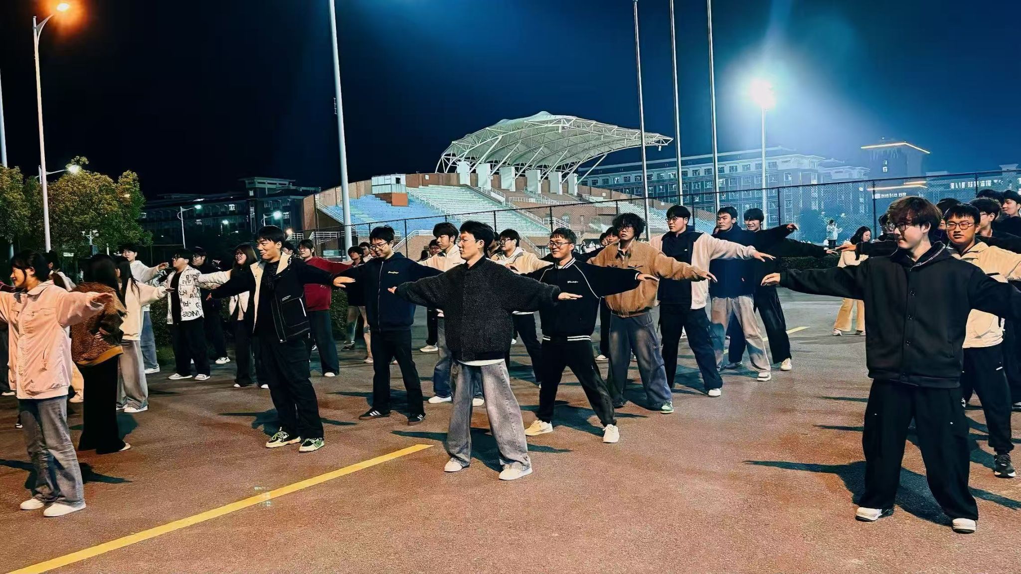 排练现场,负责人率先示范,带领同学们从动作规范度、节奏统一性到队形变换流畅度逐一打磨。无论是手臂伸展的角度,还是步伐移动的间距,大家都反复练习、相互纠错;即便汗水浸透训练服,同学们依旧保持高昂热情,用专注与坚持诠释着建工学子的拼搏精神。