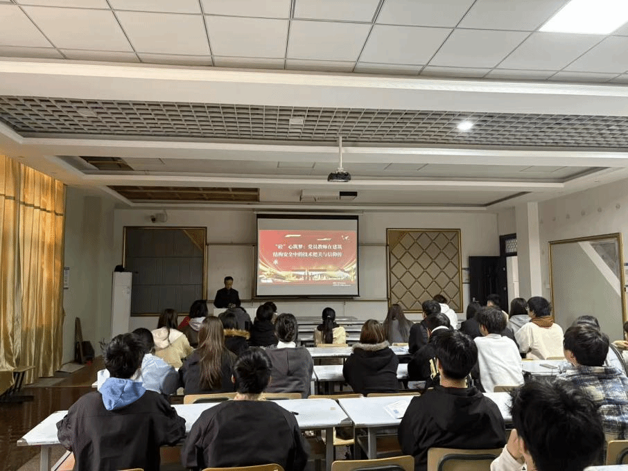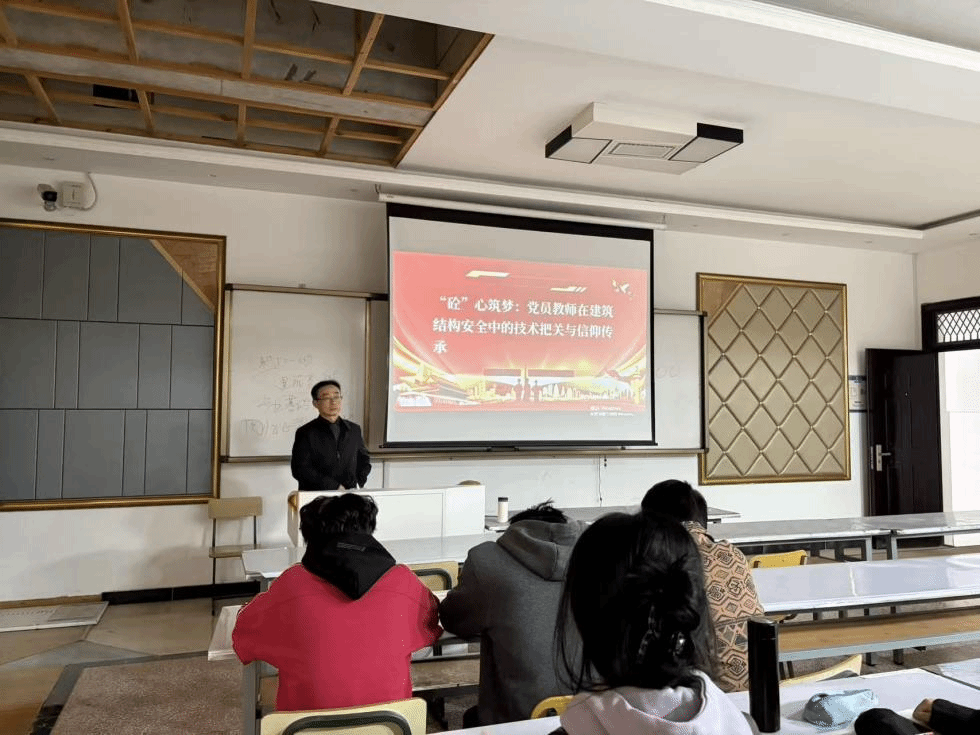 党课伊始,李玉荣以“砼”字破题:“‘砼’是混凝土的学名,也是建筑结构的‘肌肉与骨骼’。一栋楼的抗震能力、使用寿命,关键取决于结构设计是否科学、材料配比是否精准、施工操作是否规范——而这些环节的‘最后一关’,往往由党员技术人员把关。”他强调,党员教师不仅是技术标准的执行者,更是安全底线的守护者,用专业能力与党性修养共同筑牢建筑安全的“红色防线”。