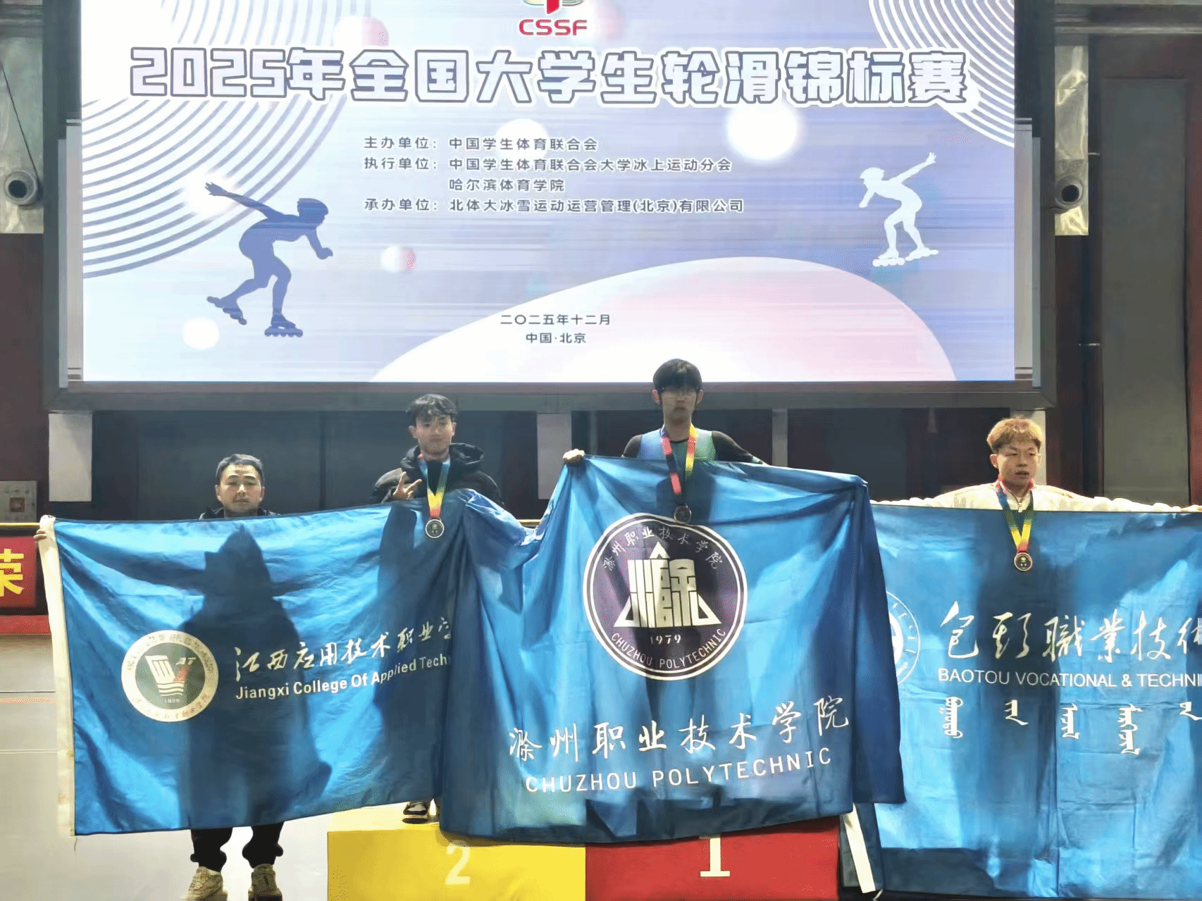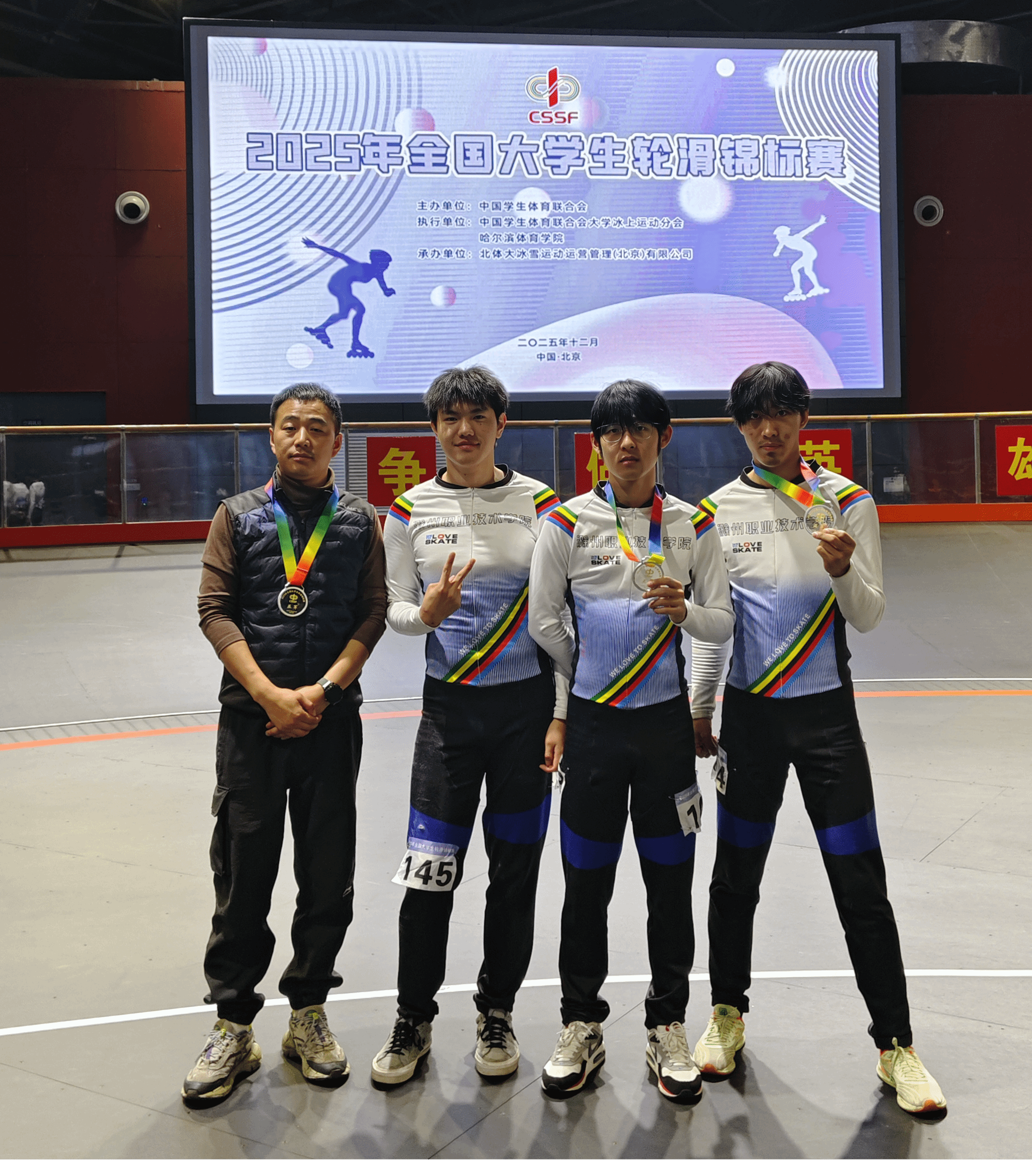 2025年12月22日至26日,由中国学生体育联合会主办、中国学生体育联合会大学冰上运动分会、哈尔滨体育学院执行、北体大冰雪运动管理(北京)有限公司承办的2025年全国大学生轮滑锦标赛在北体大二七国家冰雪运动训练科研基地开幕。本次比赛共有来自哈尔滨体育学院、上海体育大学、东北大学、北京体育大学等全国79所高校79支代表队,464名领队、教练员、运动员参赛。并吸引了世界级选手参赛,赛场氛围十分热烈,比赛分为甲组(普通组)、乙组(高职高专组)、丙组(高水平组)三个组别,比赛分为自由式轮滑和速度轮滑二大项,我校轮滑队参加速度轮滑五个小项:200米计时赛,500米+D争先赛,1000米计时赛,3000米接力赛,5000米淘汰赛,分设男子组、女子组。在李天齐教练员的指导下我校男子轮滑队在比赛中奋勇拼搏,展现了滁职学子的拼搏精神,不负众望,获得了本次比赛男子乙组的500米+D争先赛冠军,3000米接力第二名,200米第五好成绩!