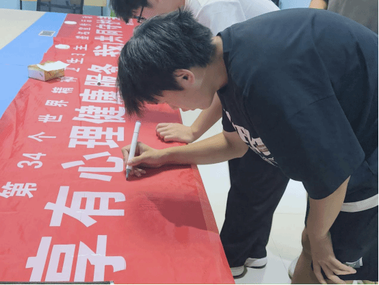 活动中同学们积极参与,同学们有序排队,郑重地在宣传横幅上签上自己名字,以签名形式传递 “关注自我心理、关爱他人精神健康” 的信念,短短两小时内,横幅便布满了一个个充满温度的签名。