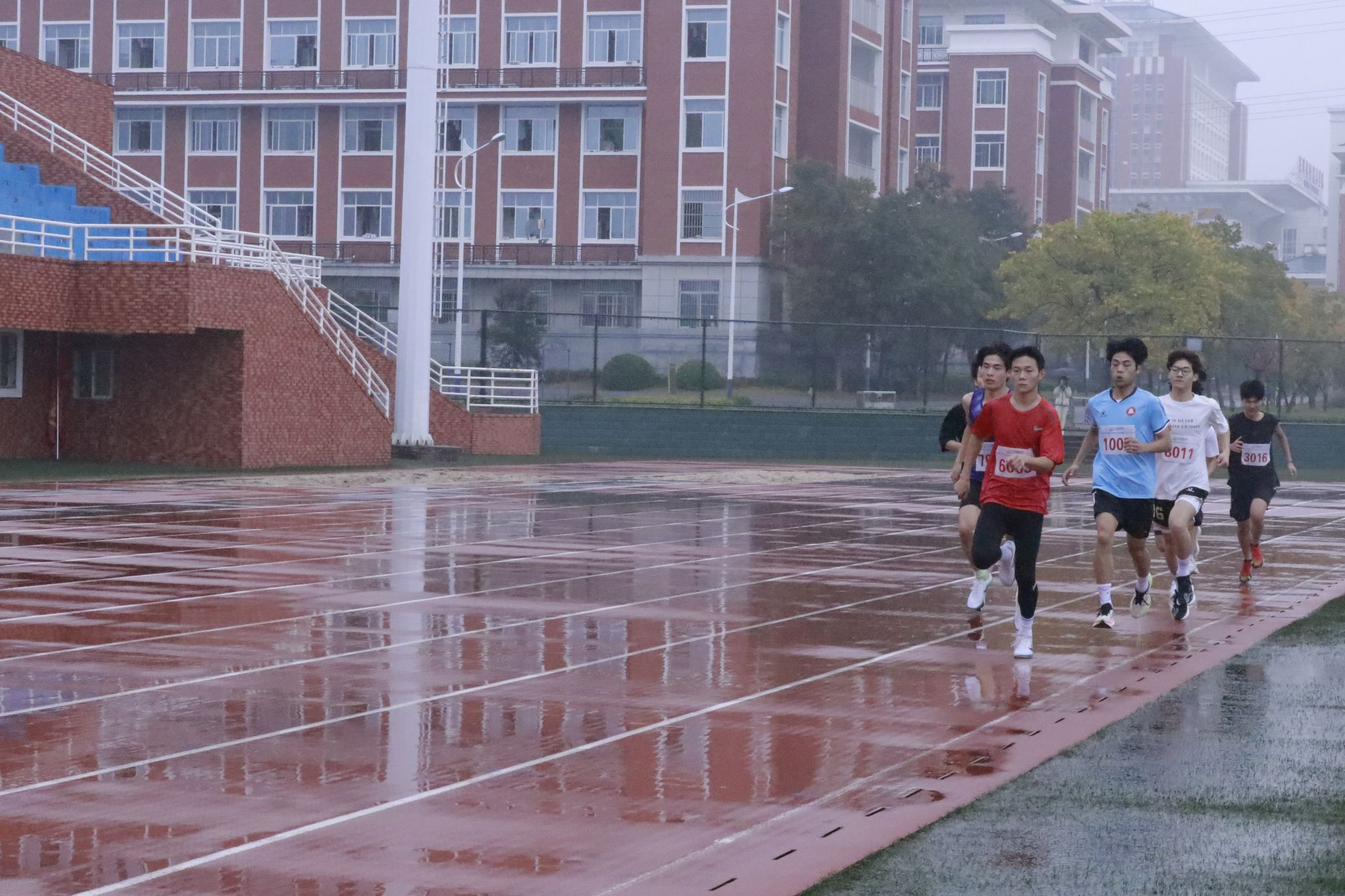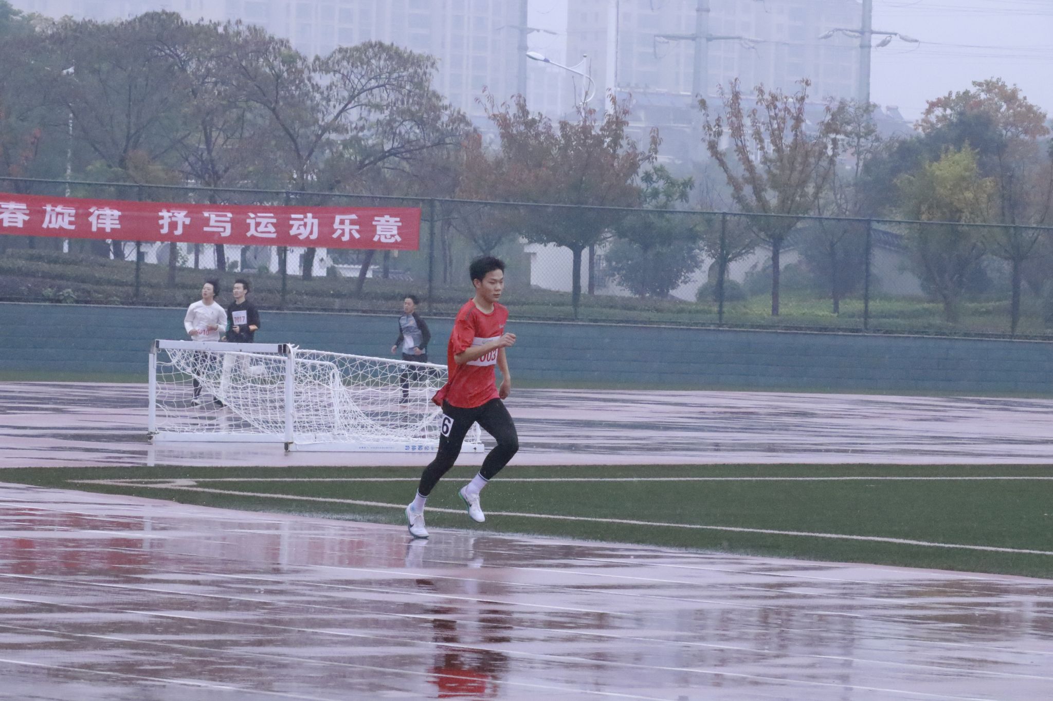 在随后进行的女子4×100米接力赛中,雨势未歇,挑战升级。传媒与设计学院代表队的四位姑娘在湿滑的跑道上默契配合、奋勇争先。每一次接力棒的传递,都不仅是速度的交接,更是信任与责任的传递。她们起跑稳健,衔接流畅,即便雨水模糊了视线,依然顶住压力,不断扩大领先优势。最后一棒选手在呐喊声中接过接力棒,全力冲刺,最终不负众望,为学院赢得该项目荣誉。她们用完美的配合展现了“团结一心,其利断金”的竞技精神,成为雨中一道亮丽的风景线。
